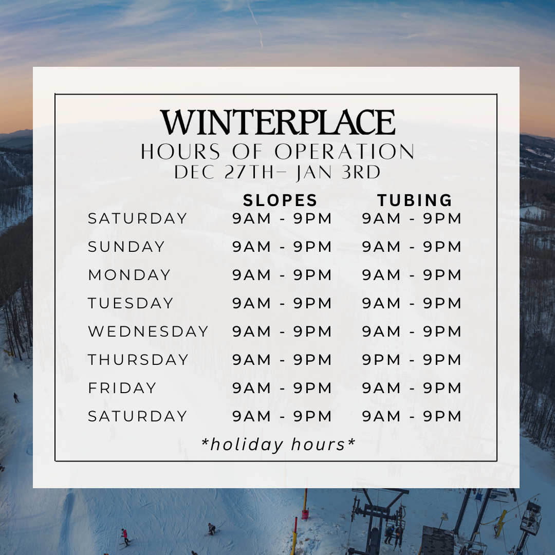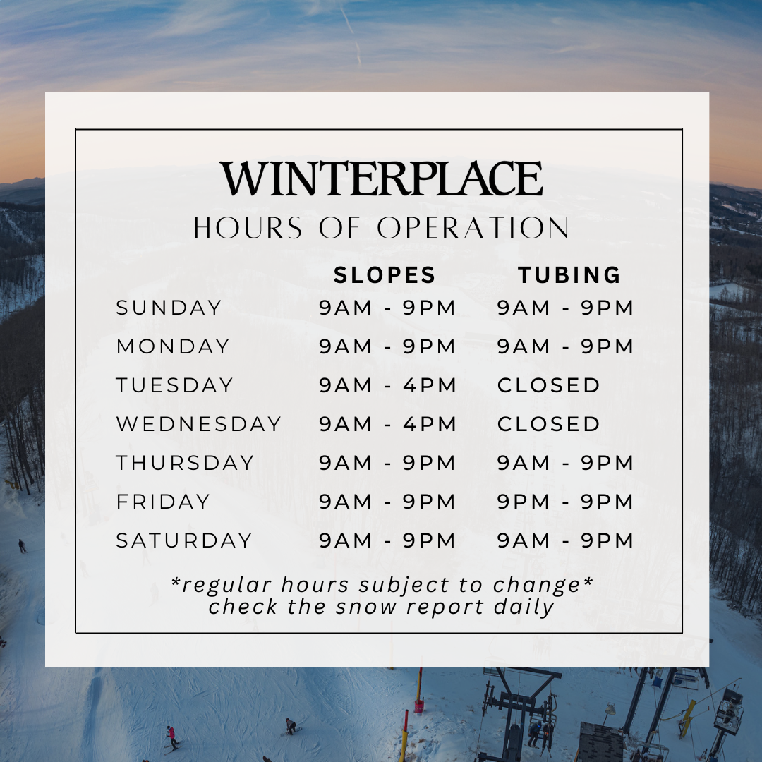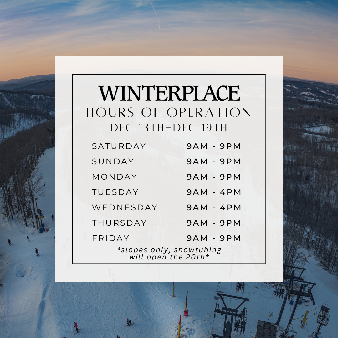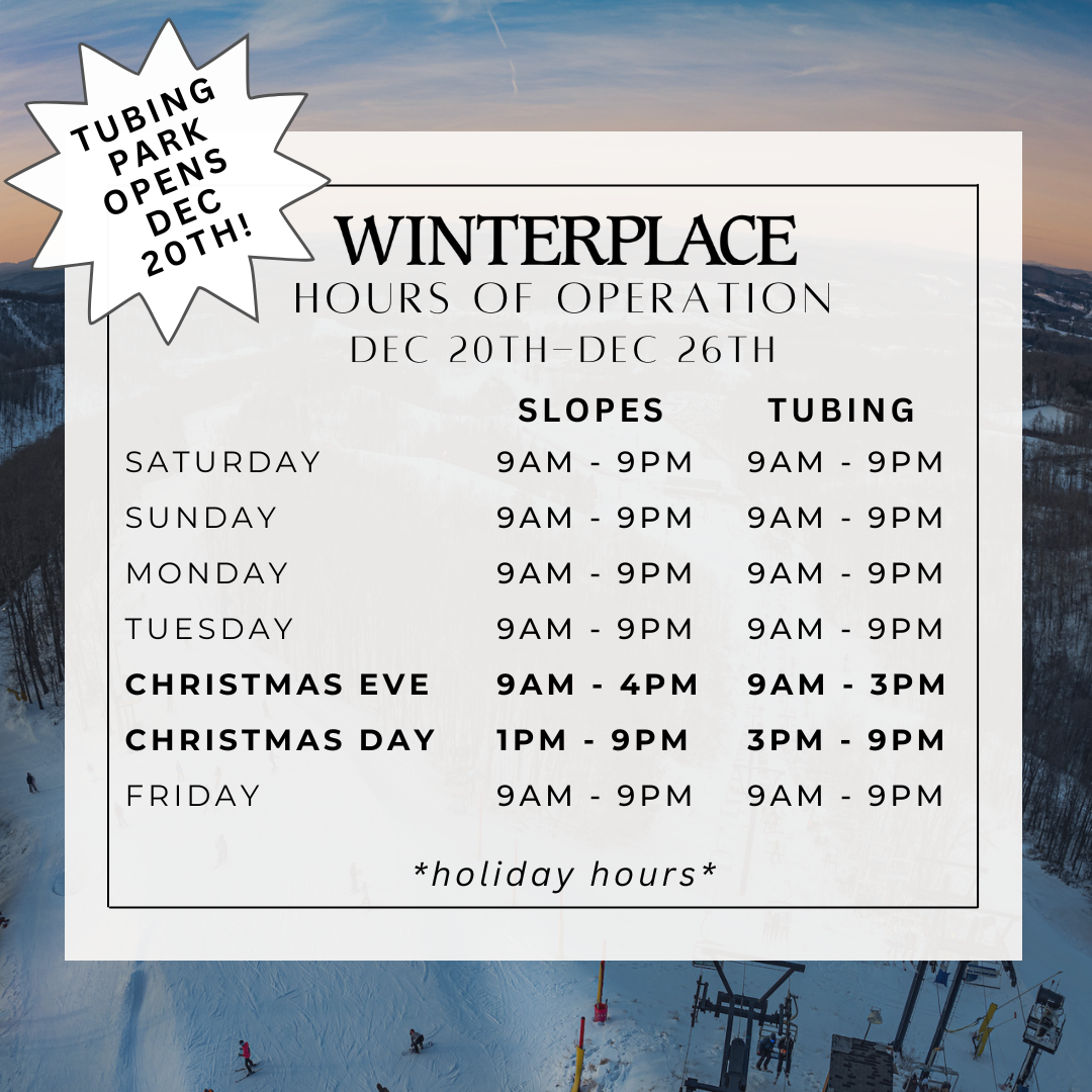 The 2025/2026 season is right around the corner! Our opening date is weather dependent. Winterplace seasons historically run from beginning to mid December through early March.